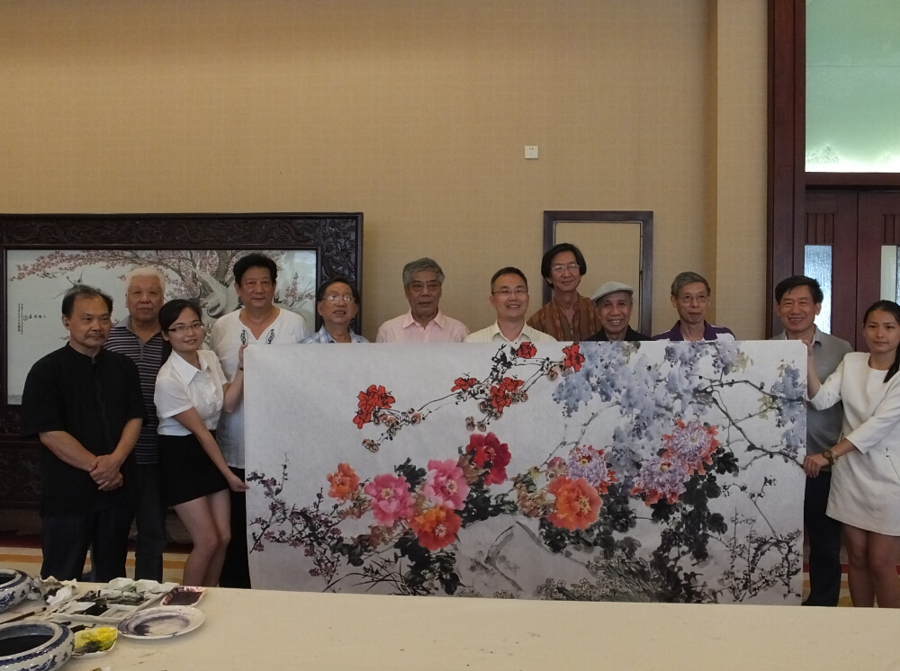 在廣州畫(huà)壇,李筱孫、葉泉、許固令、陳永康、盧德平、招熾挺、黃樹(shù)文、陳永鏘、陳孝能九位畫(huà)家常常在一齊談藝論道,因而被行內人雅尊為“羊城九老”。幾十年來(lái),九位畫(huà)友一直以文會(huì )友,以畫(huà)交心,情誼深厚。此次“羊城九老”應邀光臨廣鋁集團總部,葉鵬智董事長(cháng)盛情接待了他們,并就集團的發(fā)展歷史、經(jīng)營(yíng)戰略、企業(yè)文化向他們做了介紹;葉董事長(cháng)還與他們一起用餐、座談。隨后“羊城九老”便在展廳里談笑風(fēng)生、吟詩(shī)作對并聯(lián)手作畫(huà)贈予公司留作紀念。其畫(huà)雖由九人聯(lián)手所作,卻猶如出自一人之手,渾然天成,氣勢不凡,可見(jiàn)他們的畫(huà)藝是何等精湛、情誼是何等深厚!九位畫(huà)壇耆英年紀雖已過(guò)半百,但他們依舊笑笑鬧鬧,直言不諱,童心未泯,表現出藝術(shù)家對待人生的樂(lè )觀(guān)曠達。