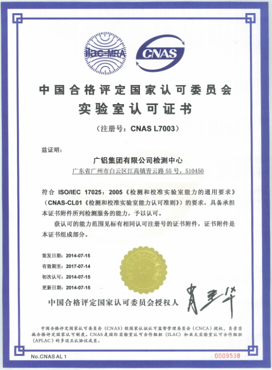 廣鋁集團有限公司檢測中心符合ISO/IEC 17025:2005《檢測和校準實(shí)驗室能力的通用要求》(CNAS-CL01《檢測和校準實(shí)驗室能力認可準則》)的要求,于2014年7月15日(7月22日獲得證書(shū))正式通過(guò)中國合格評定國家認可委員會(huì )(CNAS)的認可資格,具備承擔證書(shū)附件所列檢測服務(wù)的能力。我司檢測中心可在認證認可的范圍內使用CNAS國家實(shí)驗室認可標志,同時(shí)“廣鋁集團有限公司檢測中心”將列入中國合格評定國家認可委員會(huì )的獲準認證認可機構名錄,在CNAS官方網(wǎng)站電子注冊、發(fā)布,接受認證認可機構的監督審核,將大幅提高公司的知名度,增強公司在同行業(yè)中的市場(chǎng)競爭能力,為我司的長(cháng)期發(fā)展奠定堅實(shí)的基礎。