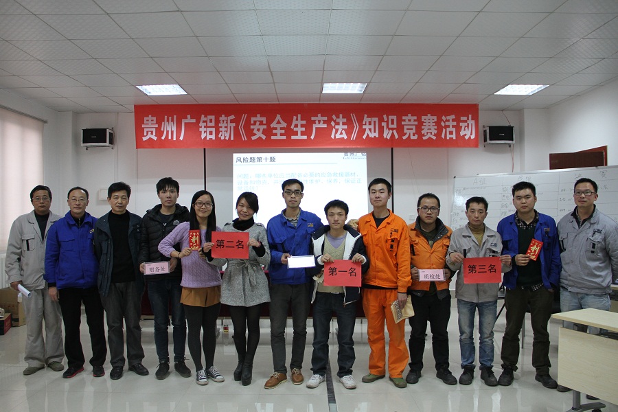 為深入宣傳貫徹國家頒布的新《安全生產(chǎn)法》,增強廣大員工紅線(xiàn)意識,促進(jìn)企業(yè)安全生產(chǎn),2014年12月24日下午14:00時(shí),貴州鋁業(yè)公司黨支部、工會(huì )、安環(huán)處共同組織開(kāi)展了新《安全生產(chǎn)法》知識競賽活動(dòng)。此次活動(dòng)在貴州鋁業(yè)公司綜合辦公樓五樓黨員活動(dòng)室舉行,公司總經(jīng)理、工會(huì )主席、安環(huán)處處長(cháng)、財務(wù)處長(cháng)等領(lǐng)導到場(chǎng)觀(guān)看了比賽。