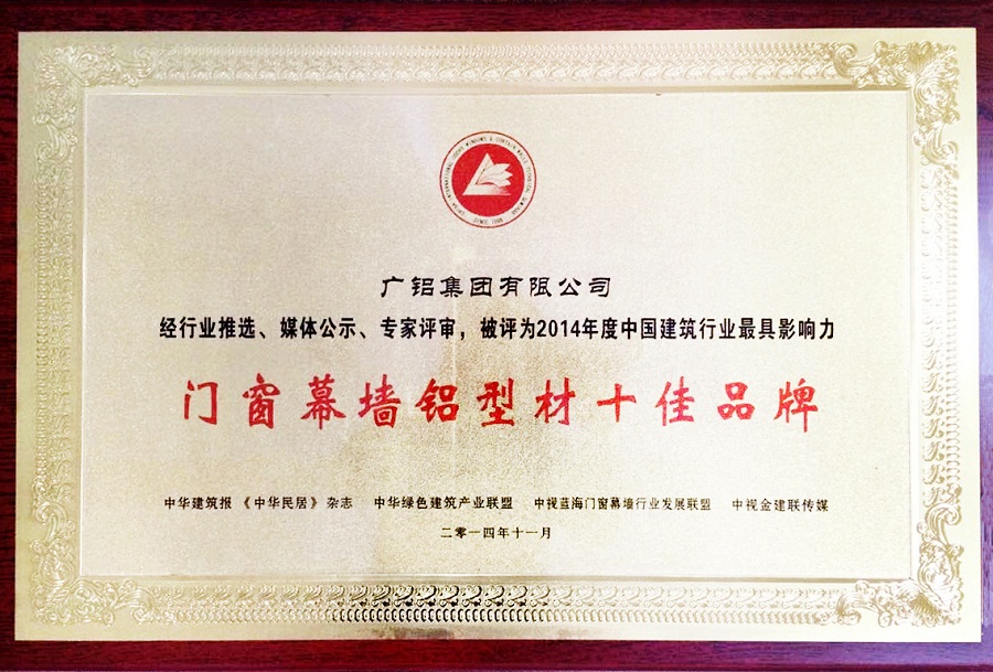 歷時(shí)三個(gè)多月,2014年度中國建筑行業(yè)最具影響力“門(mén)窗幕墻鋁型材十佳品牌”評選名單終于在11月份火熱出爐。廣鋁集團憑借雄厚的綜合實(shí)力和市場(chǎng)影響力獲此殊榮。