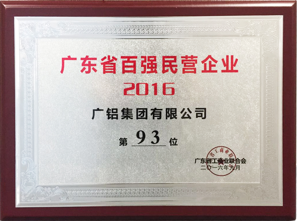 9月22日,省工商聯(lián)公布2016廣東省百強民營(yíng)企業(yè)榜單,廣鋁集團有限公司光榮入榜,位列第93位,并被授予“2016廣東省百強民營(yíng)企業(yè)”牌匾。