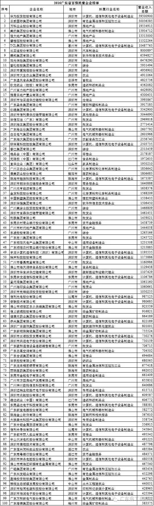 據介紹,省工商聯(lián)遵照全國工商聯(lián)關(guān)于開(kāi)展“中國民營(yíng)企業(yè)500強”排序工作的辦法和要求,今年首次開(kāi)展“廣東省百強民營(yíng)企業(yè)”排序工作。該榜單主要以2015年企業(yè)營(yíng)業(yè)收入為基本標準,以企業(yè)會(huì )計年表為依據,排序經(jīng)有關(guān)部門(mén)審核。