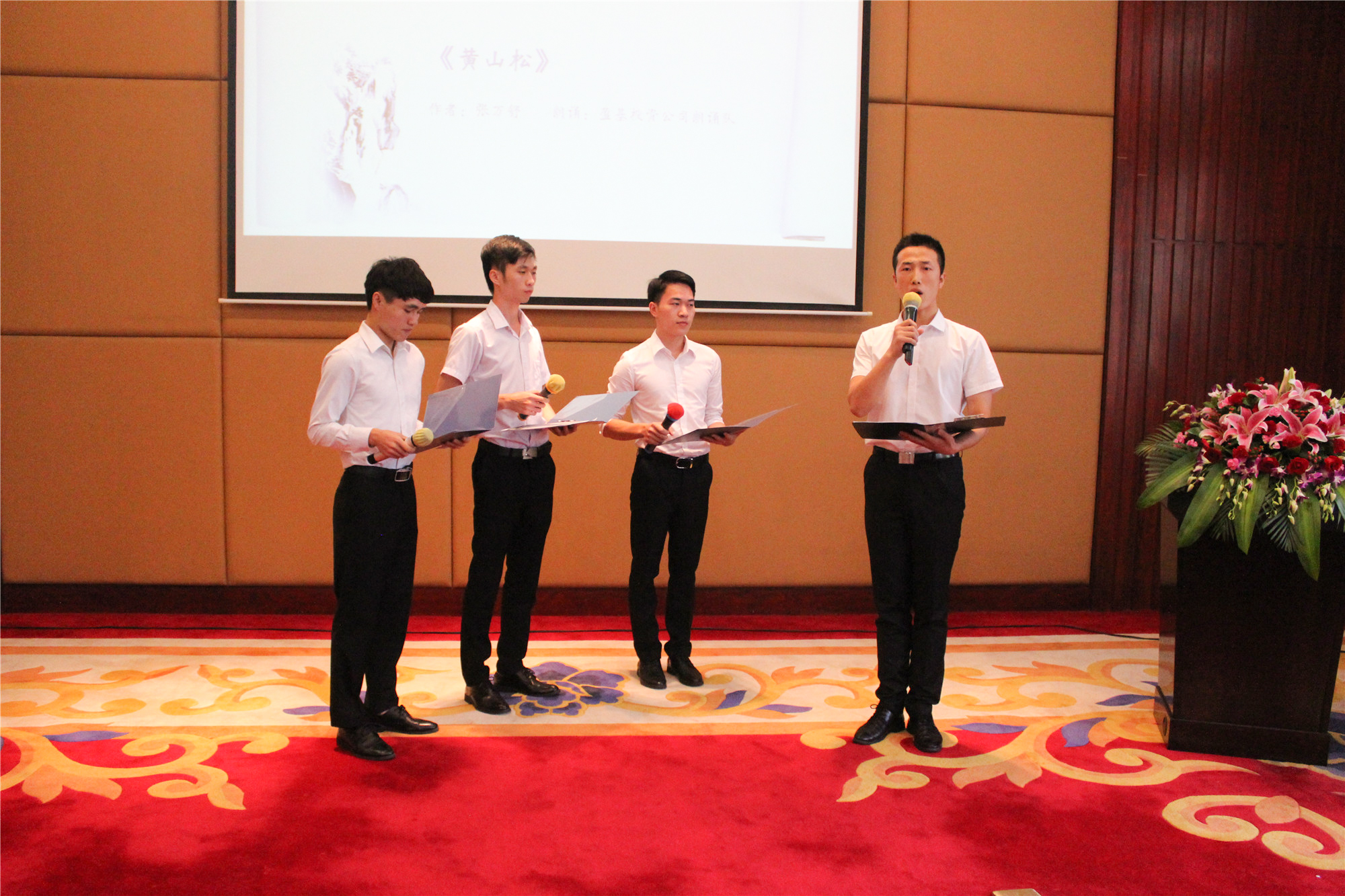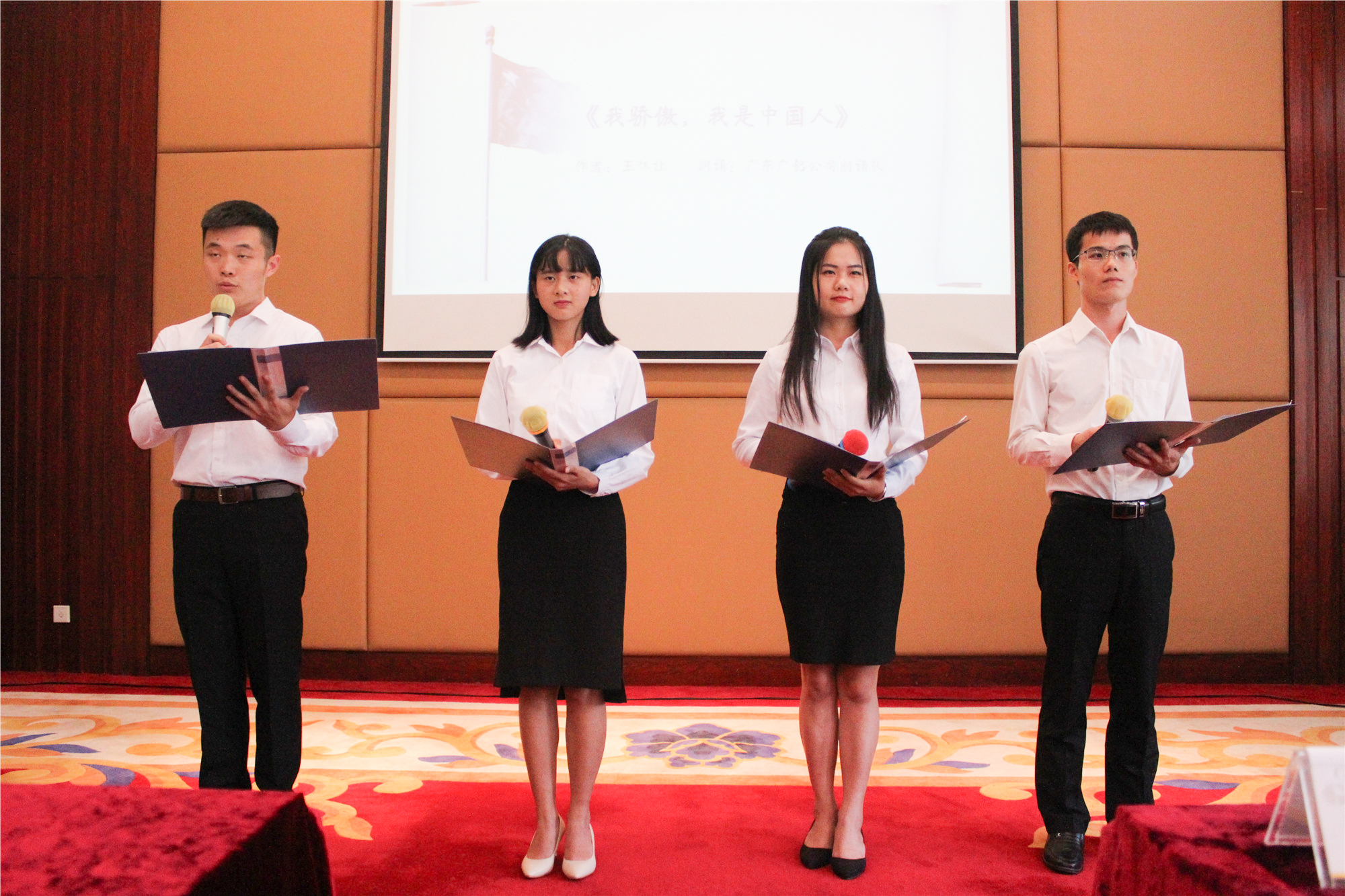 廣鋁集團本部、廣東廣鋁公司、貴州廣鋁公司、盈基投資公司分別派出才子佳人建成朗誦隊進(jìn)行演出。他們自信而滿(mǎn)懷激情,挺直腰桿站在舞臺上放聲朗誦,這個(gè)舞臺因他們而格外閃耀。