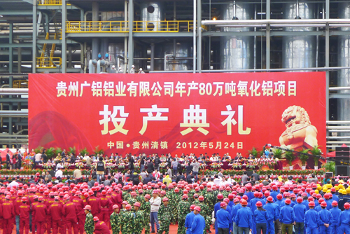 2012年5月24日,貴州廣鋁鋁業(yè)有限公司年產(chǎn)80萬(wàn)噸氧化鋁項目投產(chǎn)典禮在貴州省清鎮市隆重舉行。貴州省人民政府副省長(cháng)慕德貴,廣東省人民政府副省長(cháng)劉志庚,全國人大財經(jīng)委委員、空軍原副政委、中將芮清凱,全國政協(xié)特邀委員、武警部隊原副政委、中將劉世民,貴州省人大原常務(wù)副主任肖永安,廣州市人大主任張桂芳,廣州市政協(xié)原主席林元和,貴陽(yáng)市委副書(shū)記、市長(cháng)李再勇,廣州市人大副主任趙小穗,貴陽(yáng)市人大主任李忠,廣州市副市長(cháng)曹鑒燎,廣州市政協(xié)副主席平欣光,貴陽(yáng)市政協(xié)副主席張承新,貴陽(yáng)市人大常委會(huì )副主任、清鎮市委書(shū)記楊明晉等粵黔兩地政府部門(mén)眾多領(lǐng)導悉數出席,同時(shí)百余家關(guān)聯(lián)企業(yè)前往考察。此次投產(chǎn)典禮現場(chǎng)出席人員近2000人,場(chǎng)面空前盛大。