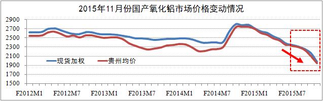 國內價(jià)格方面:統計期內,全國氧化鋁市場(chǎng)價(jià)格繼續保持了今年以來(lái)的下行趨勢,且下行幅度有所擴大。其中:11月國產(chǎn)現貨加權1985元/噸,環(huán)比下降8.3%,降幅環(huán)比擴大了4.1個(gè)百分點(diǎn);貴州均價(jià)1947元/噸,環(huán)比下降7.4%,降幅環(huán)比擴大了1.4個(gè)百分點(diǎn)。研究認為,目前氧化鋁市場(chǎng)價(jià)格直線(xiàn)下浮屬于異?,F象,主要原因是電解鋁做空力量加劇了市場(chǎng)悲觀(guān)預期。