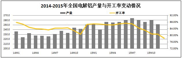 市場(chǎng)供給情況。產(chǎn)能方面,11月全國電解鋁建成產(chǎn)能約為3860萬(wàn)噸,運行產(chǎn)能為3020萬(wàn)噸,開(kāi)工率為78.2%;產(chǎn)量方面,11月電解鋁產(chǎn)量251萬(wàn)噸,同比增長(cháng)3.9%,累計同比增長(cháng)9.9%,其中:山東、新疆、內蒙、河南四省份全國產(chǎn)量占比63%。截至12月18日,全國電解鋁合計減產(chǎn)444.5萬(wàn)噸,占國內總產(chǎn)能的11.5%,其影響效果將于2016年第二季度得到體現。