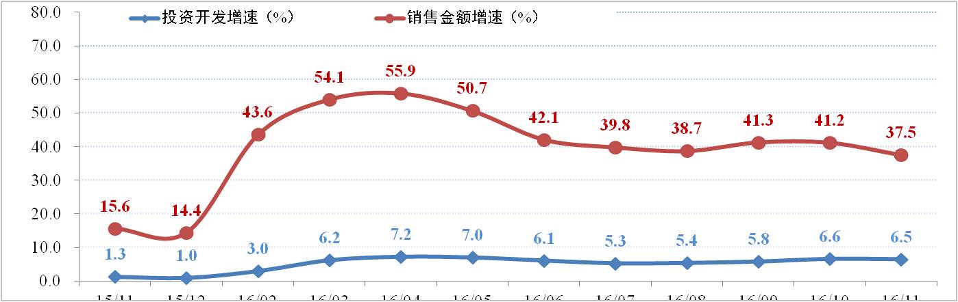 開(kāi)發(fā)投資方面:2016年1-11月份,全國房地產(chǎn)開(kāi)發(fā)投資同比增長(cháng)6.5%,增速環(huán)比回落0.1個(gè)百分點(diǎn)。其中,住宅投資同比增長(cháng)6.0%,增速提高0.1個(gè)百分點(diǎn)。住宅投資占房地產(chǎn)開(kāi)發(fā)投資的比重為67.0%,與上月持平。