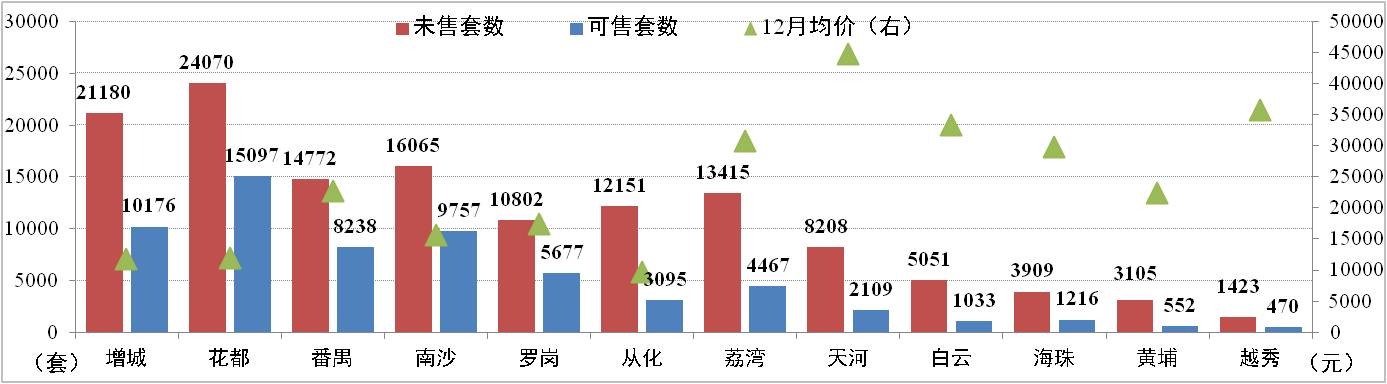 12月份廣州市新建住宅商品房共196,038套,環(huán)比增加3.6%。其中可售和未售房源分別為61,887套和134,151套,其中花都、增城、南沙以及番禺四區,合計占比分別為69.9%和56.7%;而增城占比分別為16.4%和15.8%,均出現小幅下降。