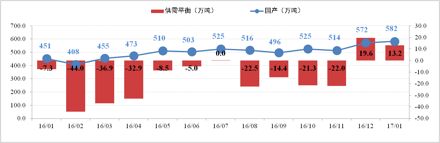 供給方面:2月10日,全國電解鋁有效產(chǎn)能為4,226.6萬(wàn)噸,運行產(chǎn)能37萬(wàn)37.5噸,開(kāi)工率為88.42%。其中,1月份電解鋁總產(chǎn)量為299.6萬(wàn)噸,供應持續增加。調研數據顯示,2017年電解鋁新產(chǎn)能已投產(chǎn)98.1萬(wàn)噸,預計年度最終實(shí)現588.5萬(wàn)噸;電解鋁復產(chǎn)21.2萬(wàn)噸,預計年內最終實(shí)現152萬(wàn)噸。