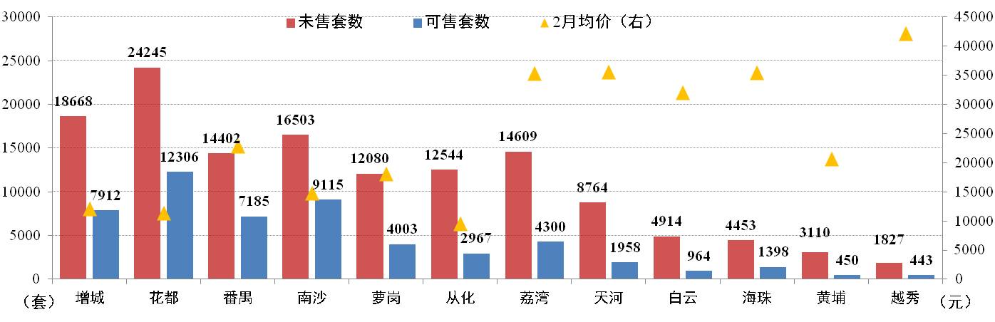截止2月28日,廣州市新建住宅商品房共189,120套,環(huán)比減少0.83%。其中可售和未售房源分別為53,001套和136,119套,花都、增城、南沙以及番禺四區,合計分別占68.9%和54.23%;增城分別占14.9%和13.7%。