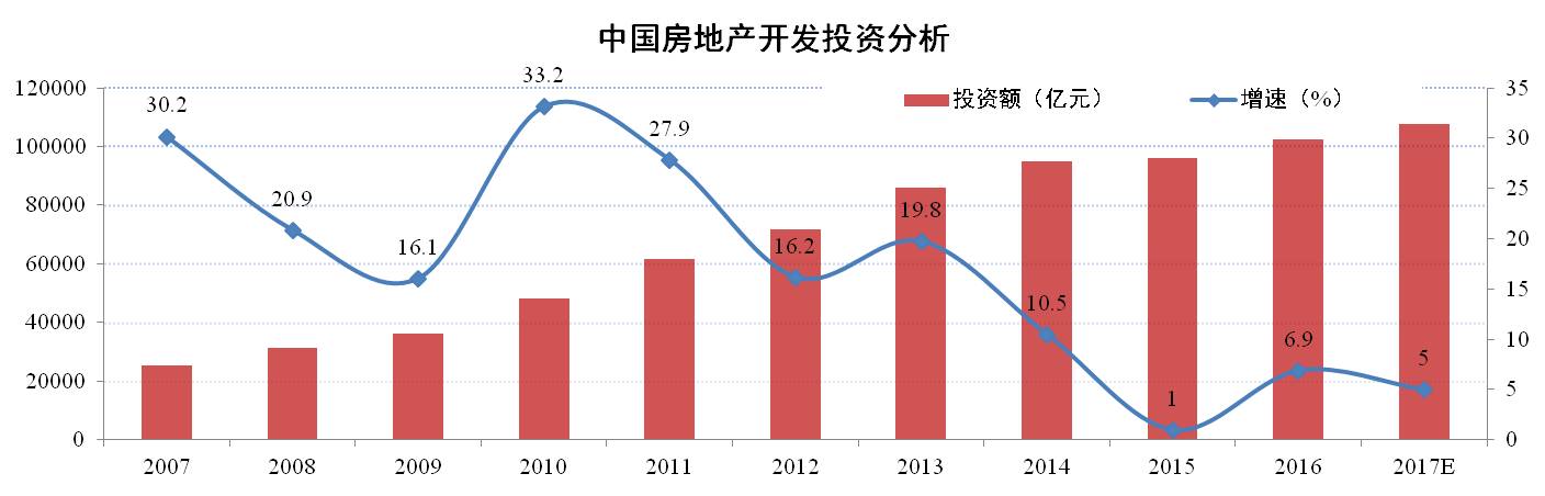 2017年政府工作報告再次明確房地產(chǎn)居住屬性定位,指出堅持住房的居住屬性,落實(shí)地方政府主體責任,加快建立和完善促進(jìn)房地產(chǎn)市場(chǎng)平穩健康發(fā)展的長(cháng)效機制,以市場(chǎng)為主滿(mǎn)足多層次需求,以政府為主提供基本保障。預計2017年隨著(zhù)調控政策不斷疊加、調控效果不斷釋放,市場(chǎng)降溫幅度將逐步擴大,但由于當前調控以穩為主,房地產(chǎn)市場(chǎng)總體將呈現平穩的趨勢。因此,2017年房地產(chǎn)開(kāi)發(fā)投資增速或維持在5%以?xún)?,去庫存和降杠桿仍將是2017年兩大主要任務(wù)。