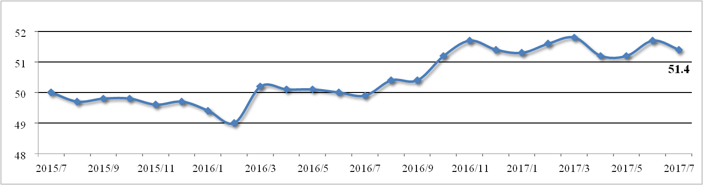 7月官方制造業(yè)PMI為51.4%,略低于預期,較上月回落0.3個(gè)百分點(diǎn),依然 位于景氣區間。生產(chǎn)指數與新訂單指數差值大幅縮小至0.7個(gè)百分點(diǎn),反映制造 業(yè)供求關(guān)系有所改善,對商品價(jià)格形成支撐。