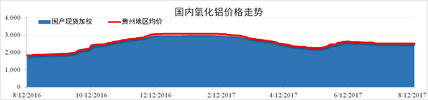 7月份電解鋁與氧化鋁減產(chǎn)消息共同擾動(dòng)氧化鋁市場(chǎng)。由于現貨交易極少,市場(chǎng)難以發(fā)揮價(jià)格發(fā)現的功能。截止8月14日,國產(chǎn)氧化鋁現貨加權均價(jià)為2,504元/噸,環(huán)比下跌1.38%。貴州地區氧化鋁現貨加權均價(jià)為2,512元/噸,環(huán)比下跌0.48%。