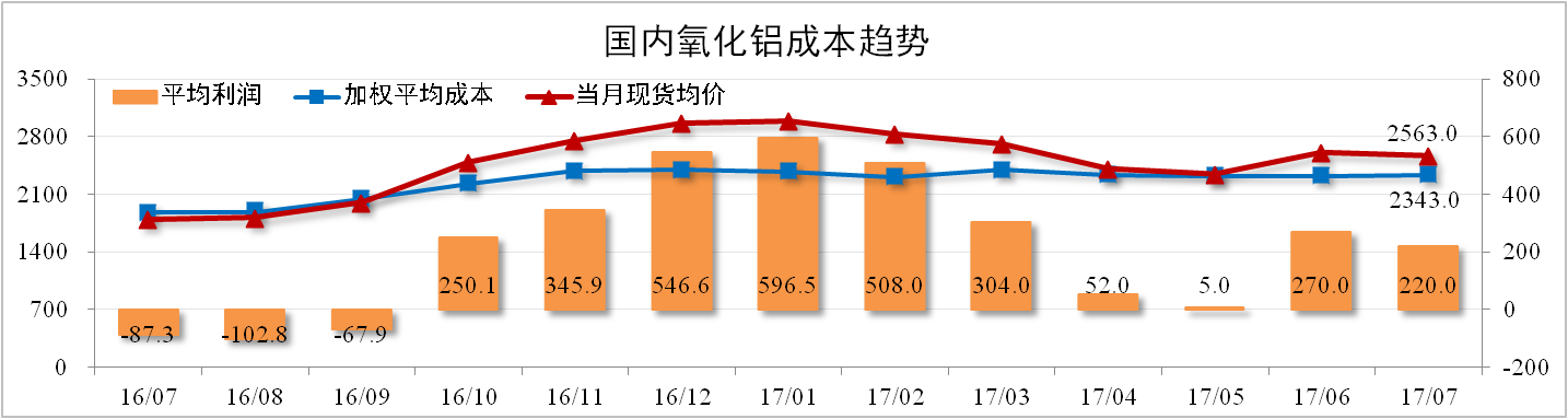 7月份,國內氧化鋁行業(yè)加權平均成本2,343元/噸,環(huán)比上漲0.56%。其中,煤炭、片堿市場(chǎng)價(jià)格維持高位,鋁土礦價(jià)格小幅上漲。全國氧化鋁現貨成交均價(jià)小幅下跌至2,563元/噸。理論上來(lái)看,氧化鋁行業(yè)平均利潤水平約220元/噸。