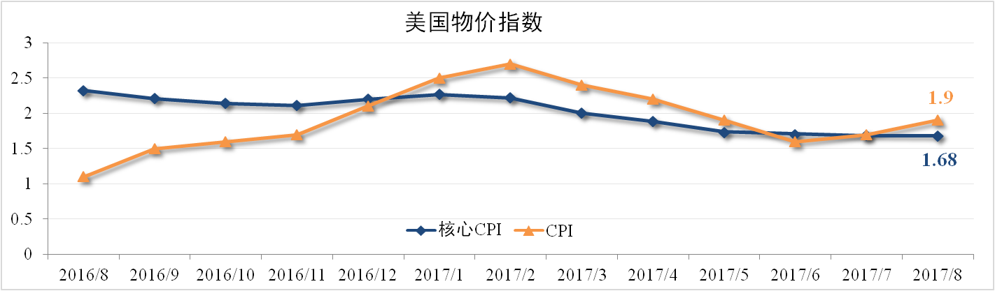 8月美國CPI為1.9%,核心CPI1.68%,雙雙超出市場(chǎng)預期。受颶風(fēng)哈維影響,墨西哥灣地區煉油廠(chǎng)被迫停產(chǎn),颶風(fēng)沿線(xiàn)地區600多萬(wàn)人口遷移,帶動(dòng)沿途汽油價(jià)格與房屋租金上漲,成為此次支撐CPI上漲的主要原因。