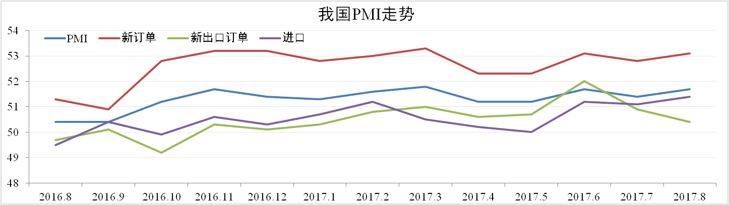 8月份我國制造業(yè)PMI為51.7,較上月上漲0.3,處于擴張區間。分項中,生產(chǎn)自53.5上升至54.1,新出口訂單自50.9下降至50.4,進(jìn)口訂單自51.1上升至51.4,主要原材料購進(jìn)價(jià)格自57.9大漲7.4個(gè)百分點(diǎn)至65.3。