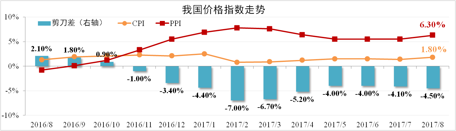 8月份CPI與PPI雙雙超預期回升。據國家統計局數據,8月份CPI為1.8%,PPI為6.3%,分別較上月擴大0.8、0.4個(gè)百分點(diǎn)。夏季極端天氣增多導致鮮菜及肉類(lèi)價(jià)格上漲是CPI上升的主要原因。剪刀差較上月擴大0.4個(gè)百分點(diǎn)至-4.5%。
