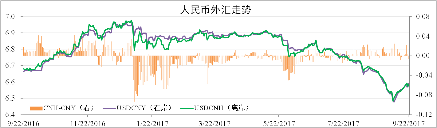 8月至9月中旬人民幣匯率呈“V”形走勢。截至9月22日,離岸人民幣匯率為6.5828,較9月7日的近一年最高點(diǎn)貶值1.53%,較8月22日升值1.16%。據央行通知,9月11日起,人民幣外匯風(fēng)險準備金自原有20%調整至0%。