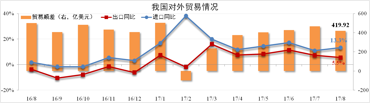 據海關(guān)總署數據,8月份我國進(jìn)口量為1572.37億美元,同比上漲13.3%,較7月擴大2.3個(gè)百分點(diǎn);出口量為1992.29億美元,同比上漲5.5%,較7月縮小1.7個(gè)百分點(diǎn)。貿易順差為419.92億美元,較上月下降10.15%。