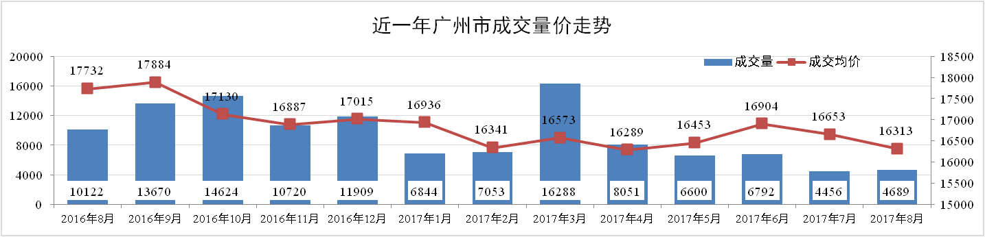 2017年8月,廣州一手住宅網(wǎng)簽呈現量增價(jià)跌現象。其中,一手網(wǎng)簽成交4689套,同比下降53.68%,環(huán)比上升5.23%;一手住宅網(wǎng)簽均價(jià)為16313元/平方米,同比下降8%,環(huán)比下跌2 %。