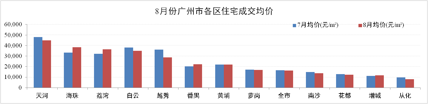 成交價(jià)方面:8月份廣州一手住宅成交均價(jià)16,313元/m2,環(huán)比下跌1.99%。其中,增城成交均價(jià)為11,617元/m2,環(huán)比上升3.03%。除海珠、荔灣、番禺及增城保持增長(cháng)外,其他區域成交均價(jià)均錄得不同程度下跌,其中越秀跌幅達20.63%。