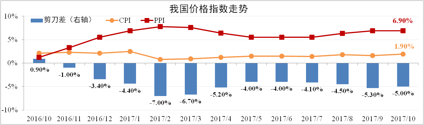 10月份我國CPI為1.9%,較上月擴大0.3個(gè)百分點(diǎn),主要受食品價(jià)格跌幅縮小以及服務(wù)價(jià)格上漲所致。10月PPI為6.9%,超出市場(chǎng)預期,有色金屬礦石開(kāi)采以及石油價(jià)格上漲是主要支撐力量。