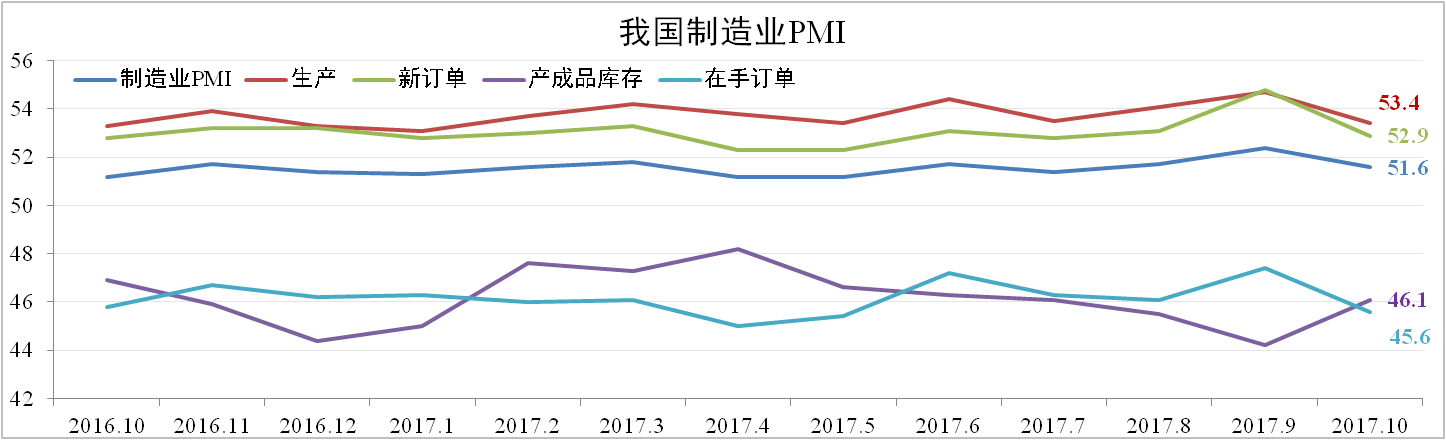 10月份我國官方制造業(yè)PMI為51.6,較上月回落0.8,達到年內均值。從分項看,生產(chǎn)、新訂單與在手訂單紛紛下降,產(chǎn)成品庫存大幅上升,說(shuō)明下游需求不足,制造業(yè)活動(dòng)較上月放緩。