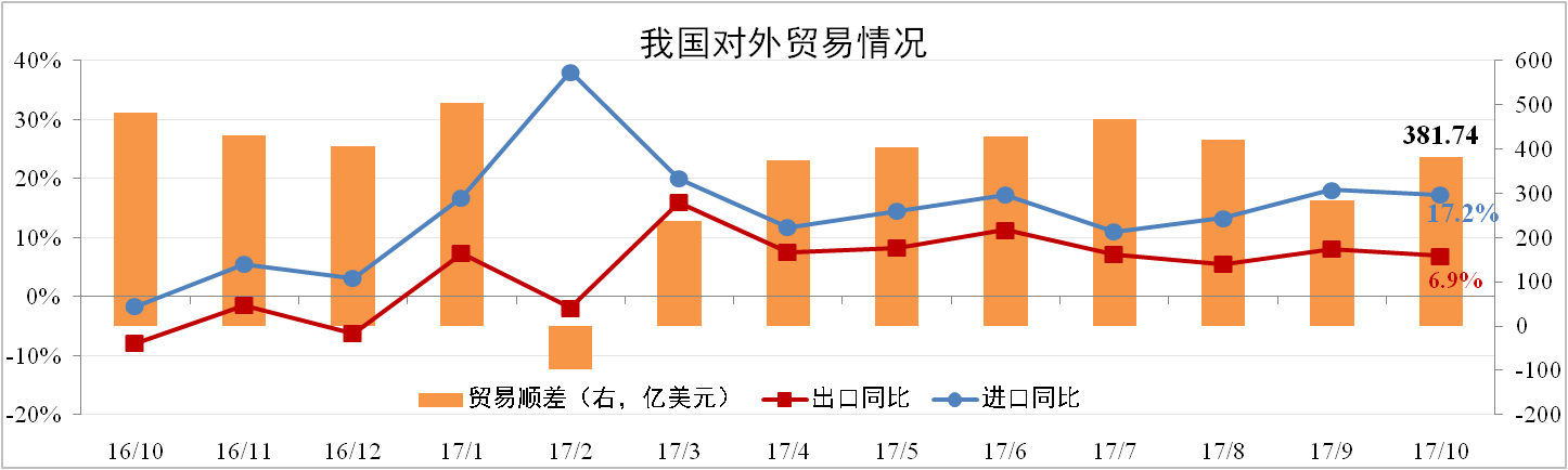 10月我國進(jìn)口量為1508.06億美元,同比上漲17.2%,出口量為1889.8億美元,同比上漲6.9%,其中機電與高新技術(shù)出口分別為8.2%與8.8%,高于總出口增速,出口結構繼續改善。10月貿易順差381.74億美元,同比下降20.9%。