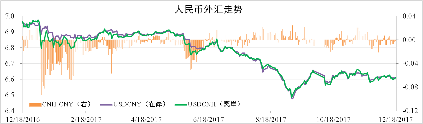 分析認為:近期人民幣小幅貶值的主要原因在于美元的走強。此前已被市場(chǎng)充分反映的美聯(lián)儲加息并未引起美元波動(dòng),而近期進(jìn)展非常順利的特朗普稅改逐步引導美元走強。由于中美利差仍處于較高水平,對跨境資本流動(dòng)形成緩沖從而支撐人民幣,預計年內人民幣走勢平穩。
