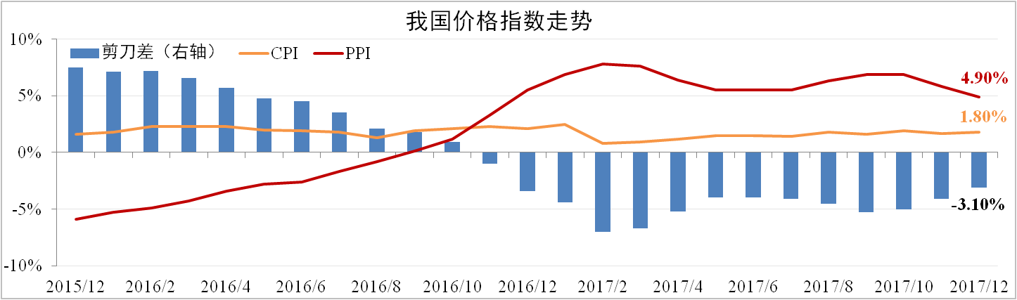 12月我國CPI同比增長(cháng)1.8%,較上月擴大0.1個(gè)百分點(diǎn),CPI年度漲幅為1.6%。PPI同比上漲4.9%,較上月下滑0.9個(gè)百分點(diǎn),PPI年度漲幅為6.3%。