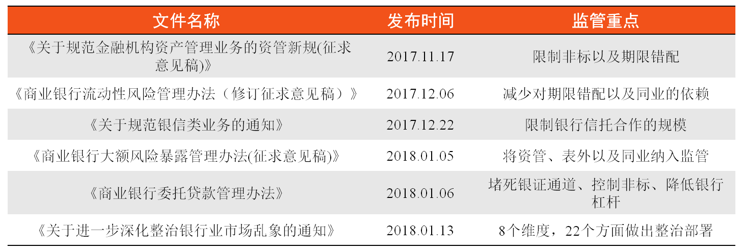 2017年11月17日至2018年1月13日,監管層連續發(fā)出多道監管政策,主要涉及銀行業(yè)。從所涉內容看,基本實(shí)現了全面無(wú)死角監管,非標準化資產(chǎn)以及通道業(yè)務(wù)基本被堵死。由于資金供給收縮,資金將通過(guò)標準化資產(chǎn)流向新興產(chǎn)業(yè)部門(mén),房地產(chǎn)、過(guò)剩行業(yè)以及融資平臺利率將有所上升。