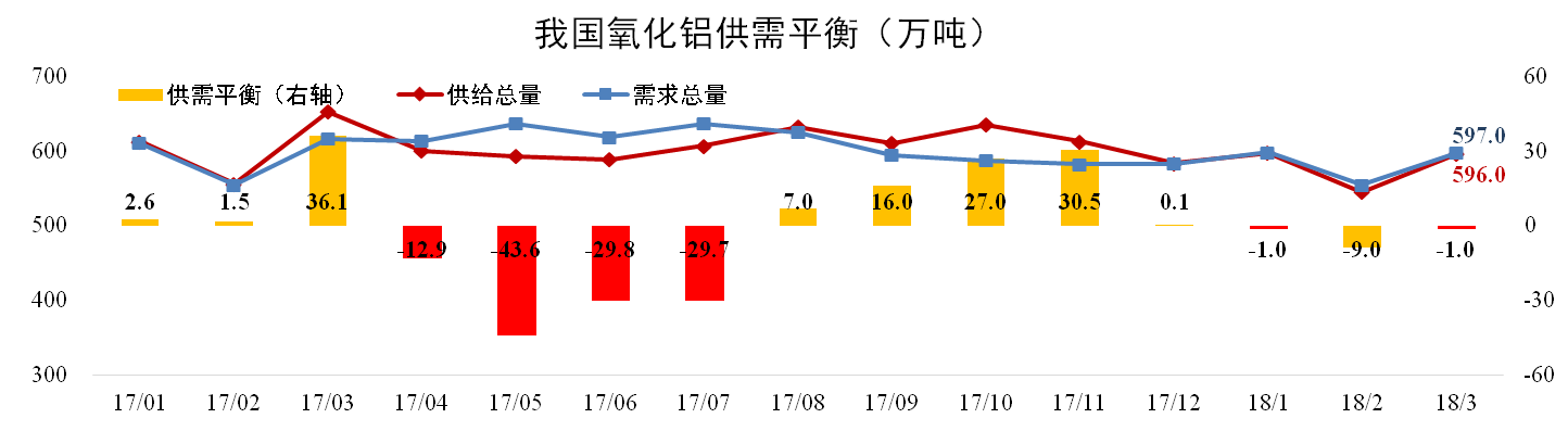 截至3月底,我國氧化鋁建成產(chǎn)能8,162萬(wàn)噸,運行產(chǎn)能6,792萬(wàn)噸,開(kāi)工率83.21%,環(huán)比上升0.68個(gè)百分點(diǎn)。其中國內氧化鋁產(chǎn)量586萬(wàn)噸,進(jìn)口氧化鋁10萬(wàn)噸,供給總量596萬(wàn)噸,測算的需求量為597萬(wàn)噸,理論短缺1萬(wàn)噸。