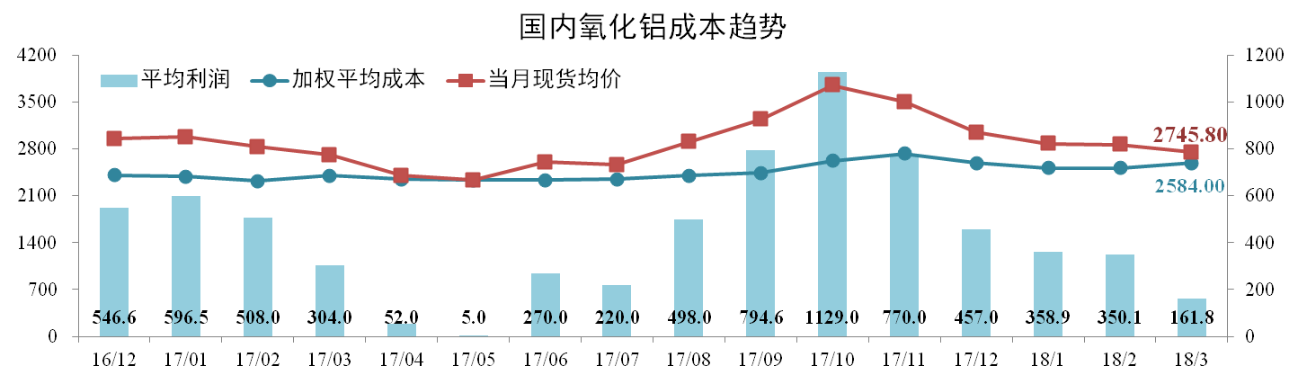 3月份國內氧化鋁加權平均成本為2,584元/噸,環(huán)比上漲2.87個(gè)百分點(diǎn)。當月全國氧化鋁現貨成交均價(jià)為2,745.8元/噸,較上月下跌4.06%。理論氧化鋁行業(yè)平均利潤水平為161.8元/噸。