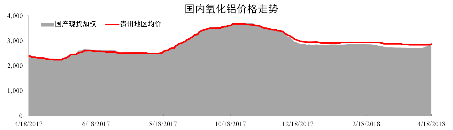 截至4月18日,國產(chǎn)氧化鋁現貨加權均價(jià)為2895元/噸,同比上漲18.03%,環(huán)比上漲5.82%。貴州地區氧化鋁現貨加權均價(jià)為2,867元/噸,同比上升19.36%,環(huán)比下跌0.46%。