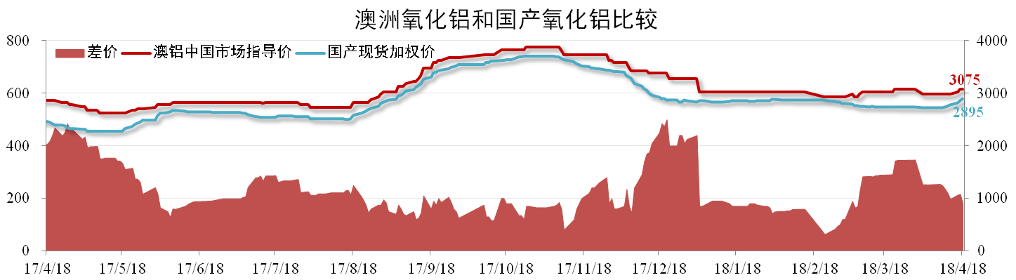 截至4月18日,國產(chǎn)氧化鋁現貨加權均價(jià)為2895元/噸,同比上升18.03%,環(huán)比上升5.82%。澳鋁中國市場(chǎng)指導價(jià)為3075元/噸,環(huán)比上升1.65%,二者價(jià)差180元/噸,較上月同期縮窄109元/噸。