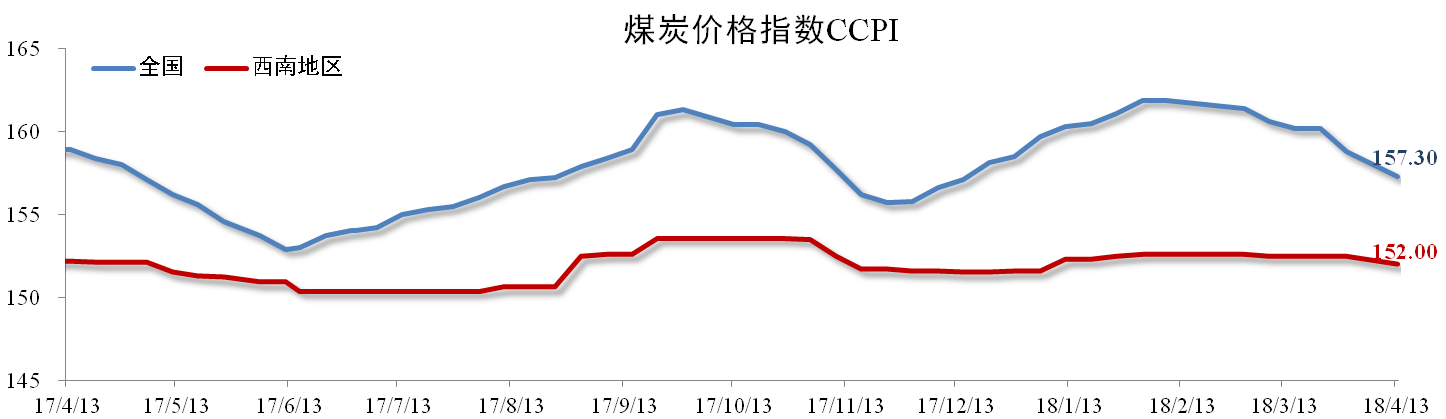 3月份我國煤炭?jì)r(jià)格呈現連續回調的趨勢。截至4月13日,全國煤炭?jì)r(jià)格指數報157.3點(diǎn),同比下降1.01%,環(huán)比下降2.05%。西南地區煤炭?jì)r(jià)格指數報152點(diǎn),同比下降0.13%,環(huán)比下降0.33%。