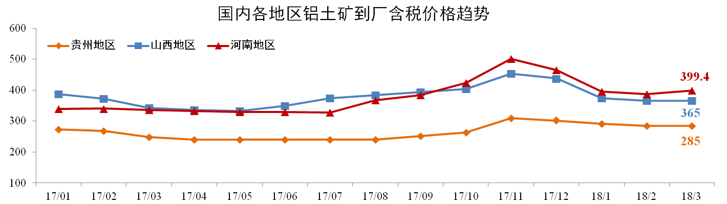 3月份各地鋁土礦價(jià)格保持穩定。截止2018年3月,貴州(AL:60%,A/S:5.5-6)到廠(chǎng)含稅價(jià)月均價(jià)285元/噸,環(huán)比無(wú)變動(dòng);山西鋁土礦365元/噸,環(huán)比無(wú)變動(dòng);河南鋁土礦399.4元/噸,環(huán)比上漲3.07%。