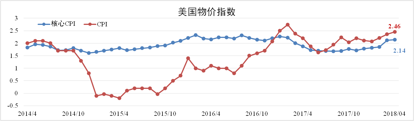 4月份美國CPI為2.46%,較上月擴大0.1個(gè)百分點(diǎn),核心CPI為2.12%,較上月擴大0.02個(gè)百分點(diǎn)。通脹雖不及預期,但均高于3月。