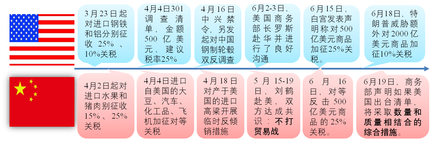 經(jīng)過(guò)多次談判,美國無(wú)視國家信譽(yù)正式開(kāi)打貿易戰。自7月6日起雙方將對進(jìn)口自對方的的500億美元商品加征25%的關(guān)稅。6月18日特朗普威脅加征2000億美元商品10%關(guān)稅,6月19日中方強硬反擊,當天全球股指暴跌。