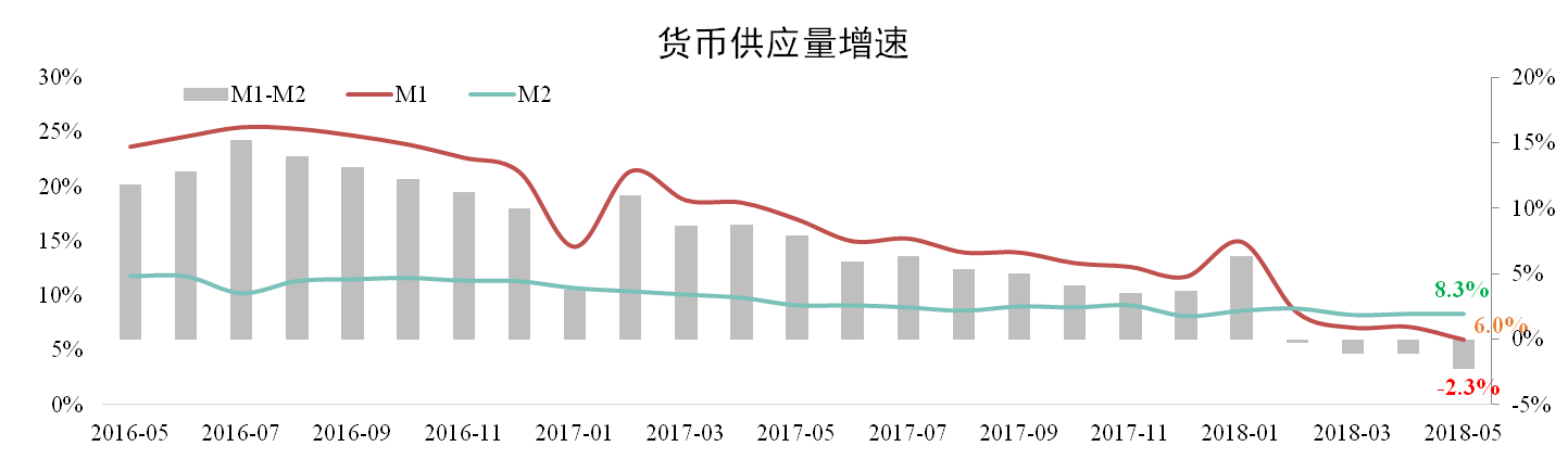 發(fā)稿時(shí)間:2018-06-22據人民銀行數據,5月份M1增速為6.0%,較上月下降2.3個(gè)百分點(diǎn),創(chuàng )兩年新低。M2增速為8.3%,與上月持平。剪刀差為-2.3%,連續4個(gè)月為負,說(shuō)明貨幣活力有所下降,實(shí)體經(jīng)濟流動(dòng)性偏緊。